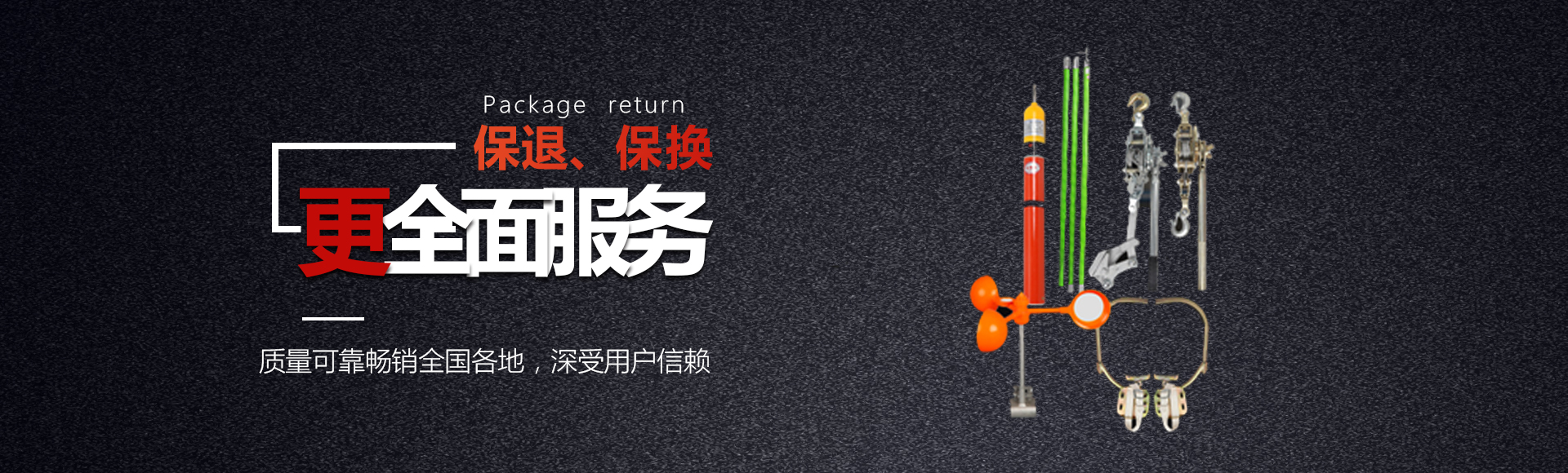 袖珍式低壓驗電筆、高壓聲光驗電器、高壓拉閘桿、安全接地棒、接地軟銅線、安全圍欄、安全帽、安全帽報警器、安全警告標志牌、安全繩、安全帶、腳扣、各種緊線器、線路金具等